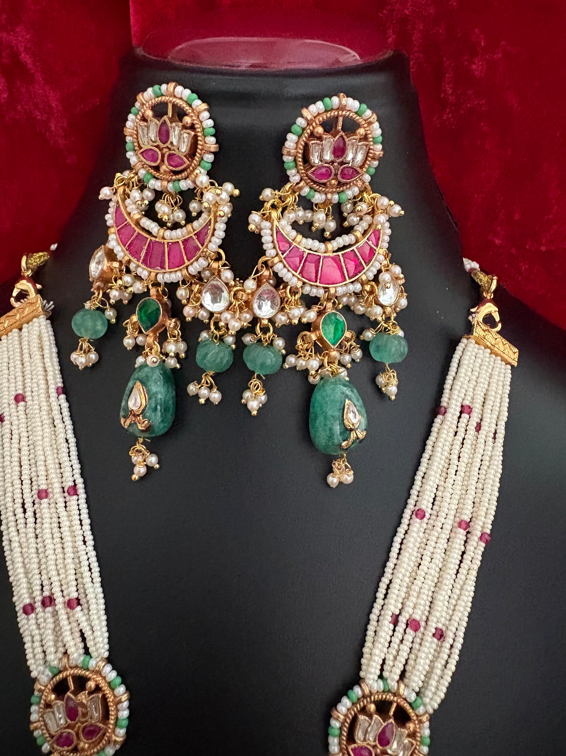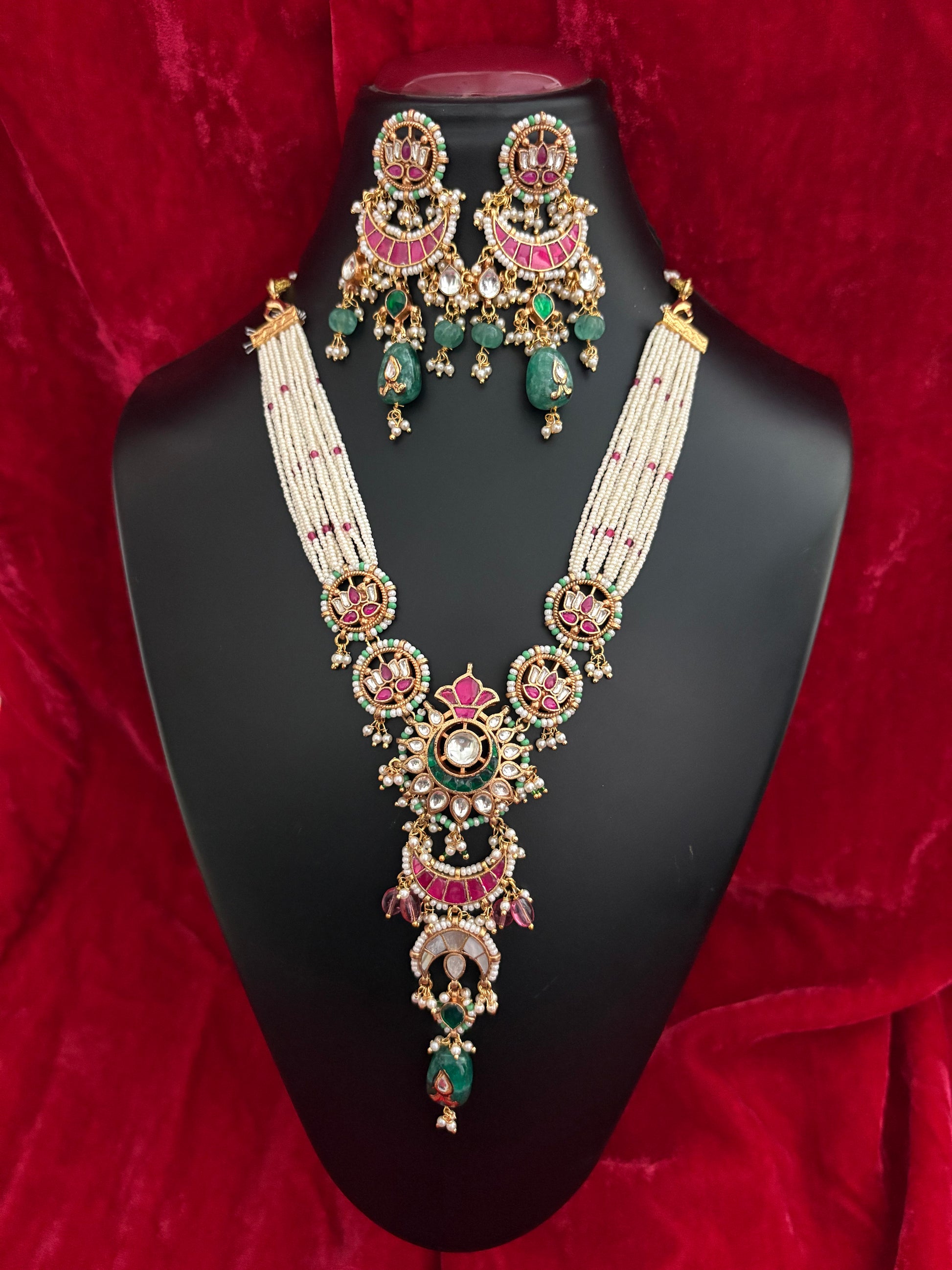 | A masterpiece of heritage Jadau craftsmanship, designed to exude elegance and grandeur Adorned with handset Polki stones and lustrous gemstones, reflecting timeless royalty Features a long, layered silhouette, perfect for weddings, festive occasions, and celebrations Intricate detailing and a regal finish make it a statement piece of unmatched sophistication Elevates any traditional ensemble with a touch of luxury, grace, and cultural richness |