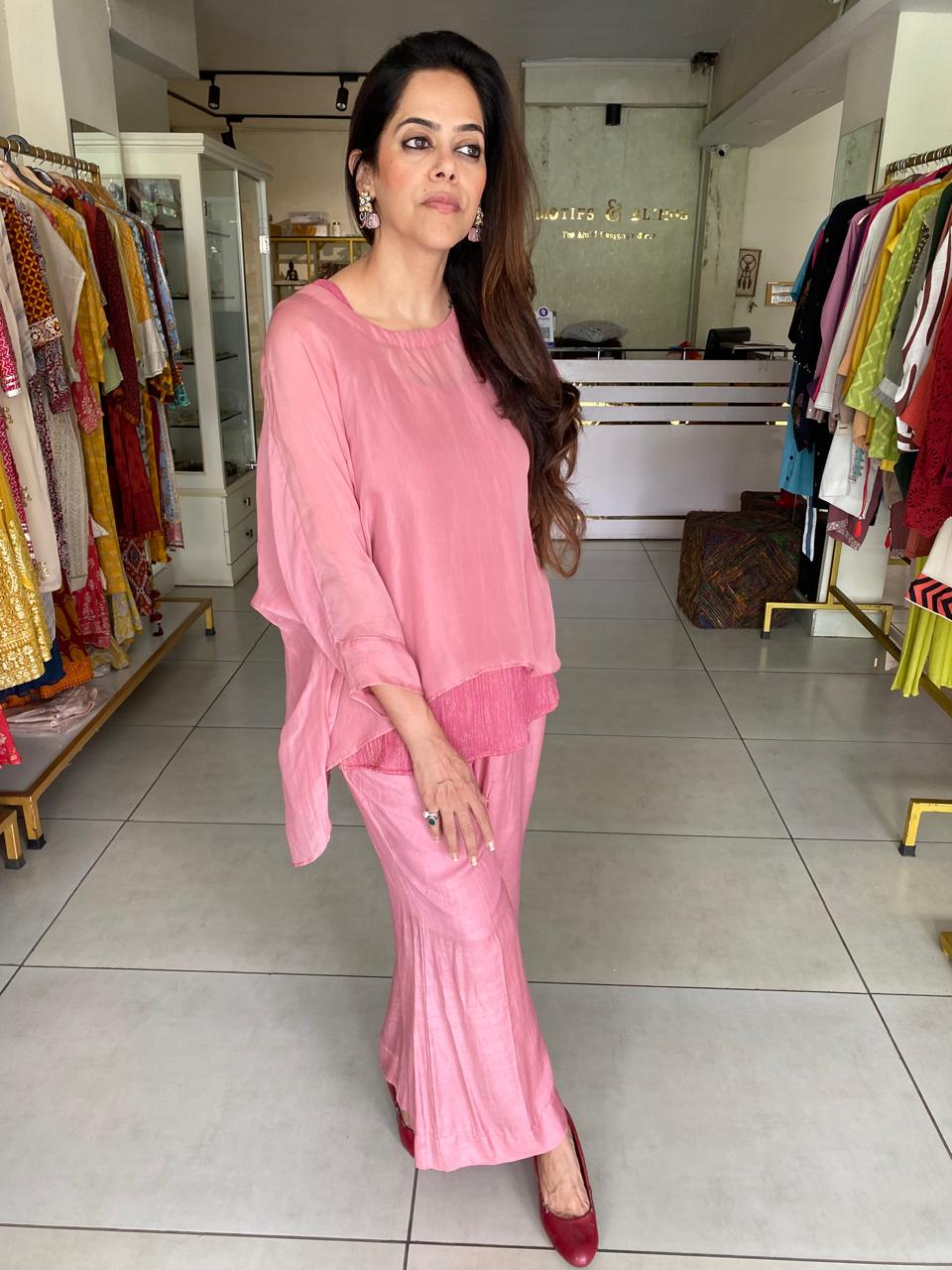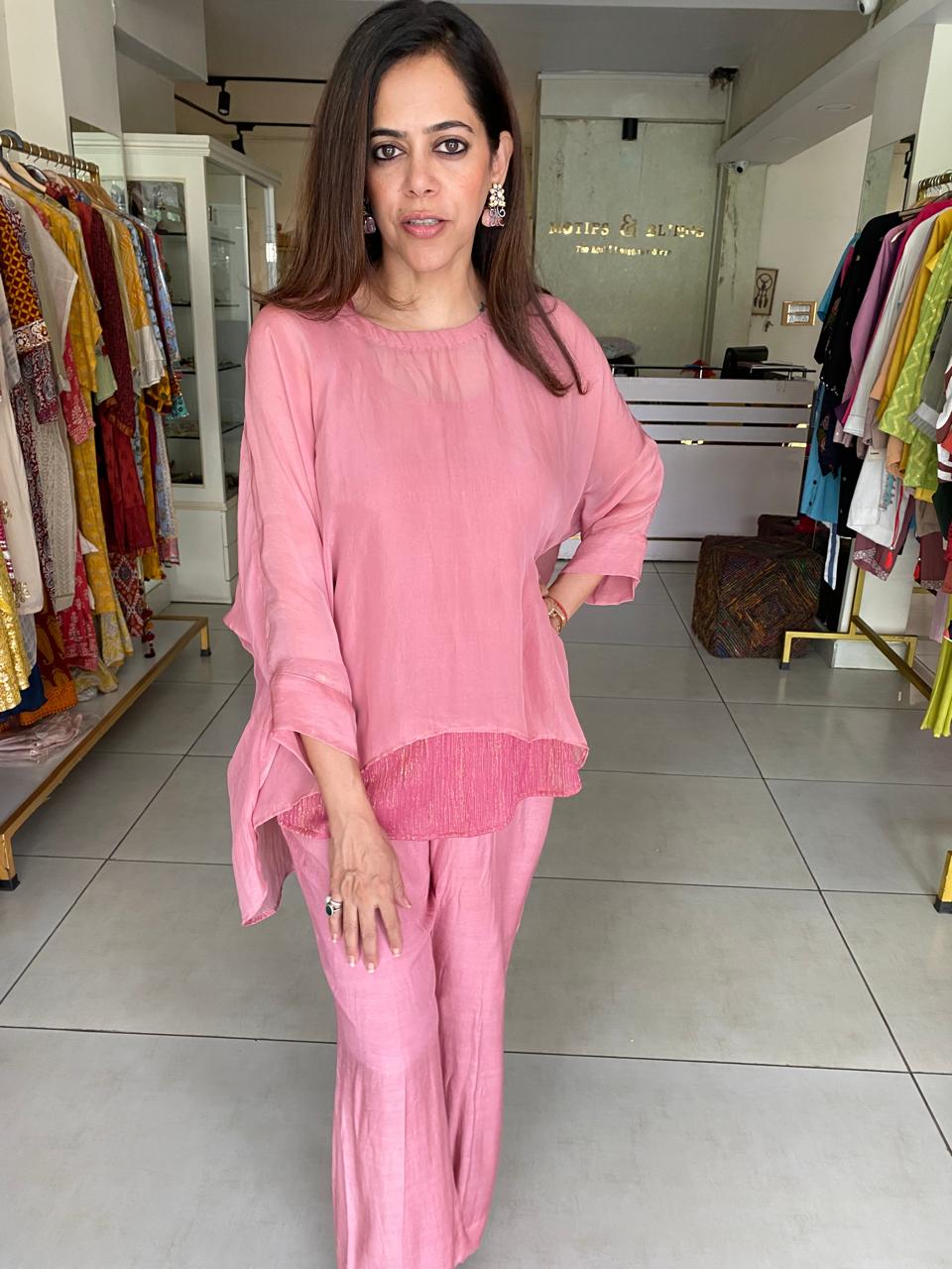Elevate your everyday elegance with this blush pink co-ord set, designed in a relaxed silhouette with soft textures and layered hem detailing. The lightweight fabric ensures breathable comfort, while the understated shimmer adds just the right touch of sophistication. Ideal for brunches, casual gatherings, or a relaxed festive look.