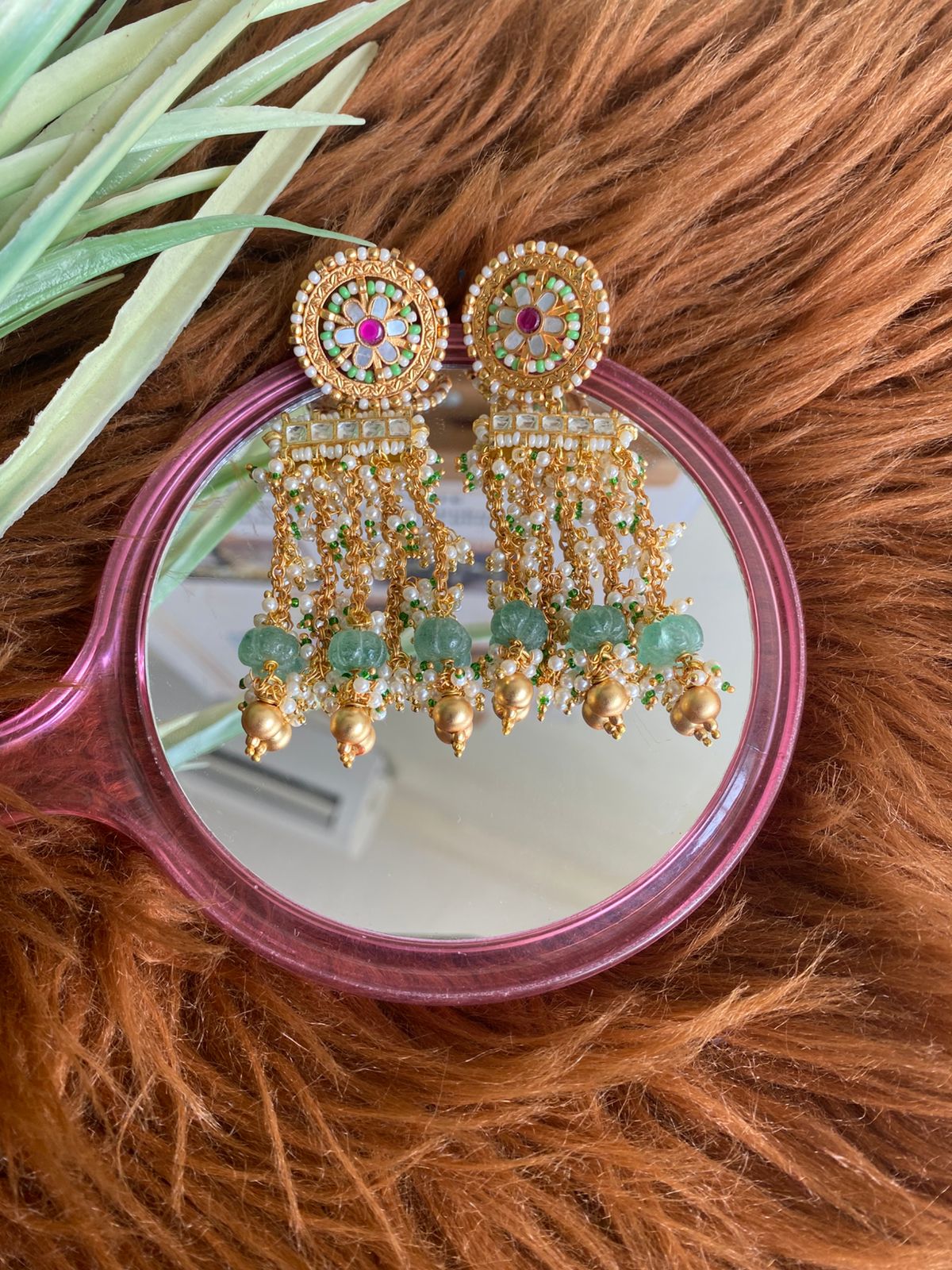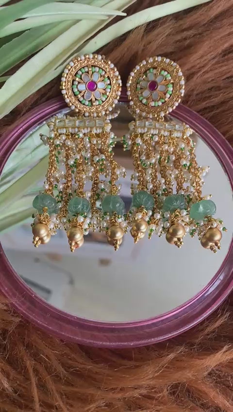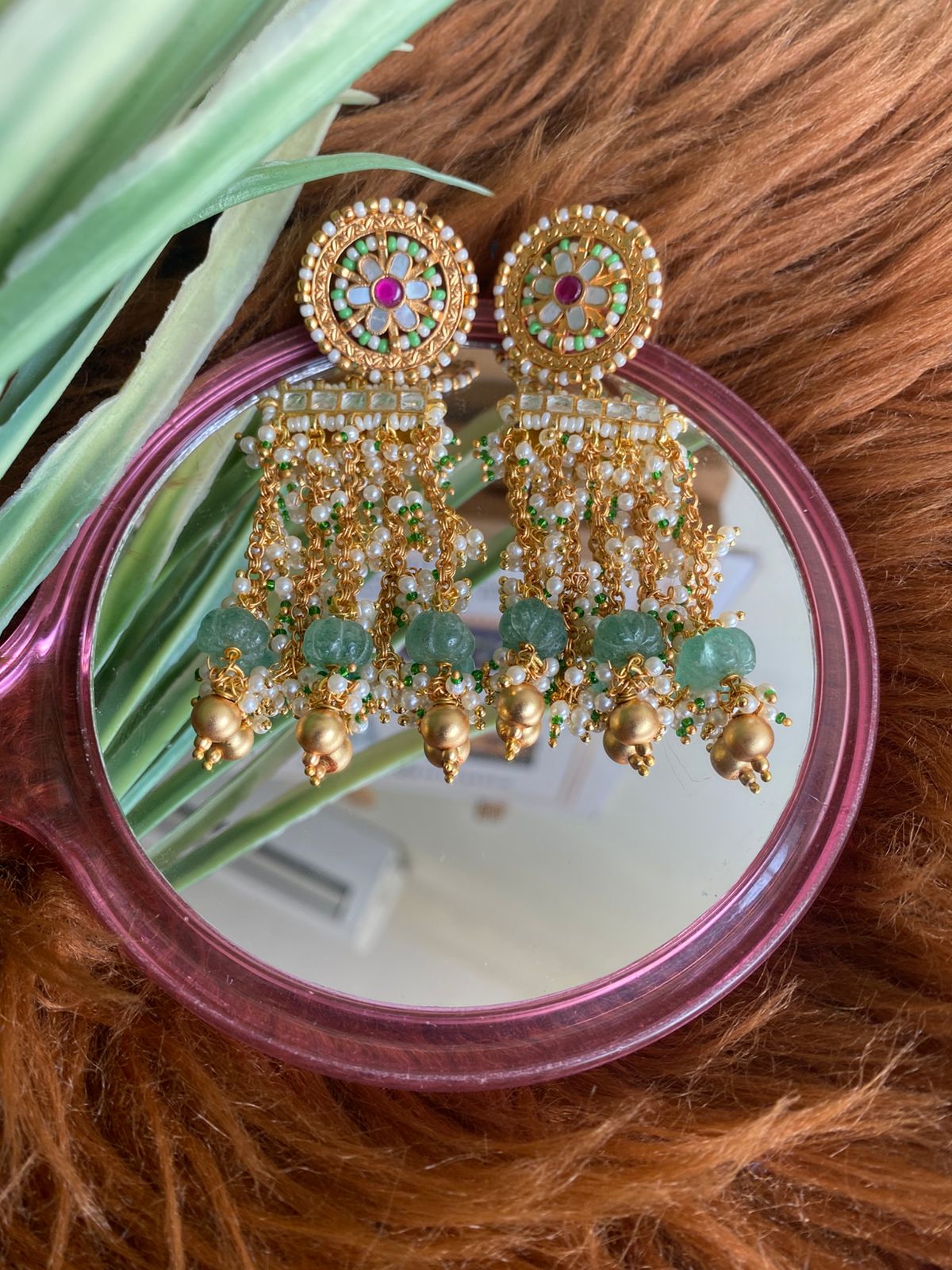 | Graceful handcrafted stone earrings featuring intricate floral carving, green beads, and pearl danglers — perfect for weddings, festive wear, and traditional outfits. |