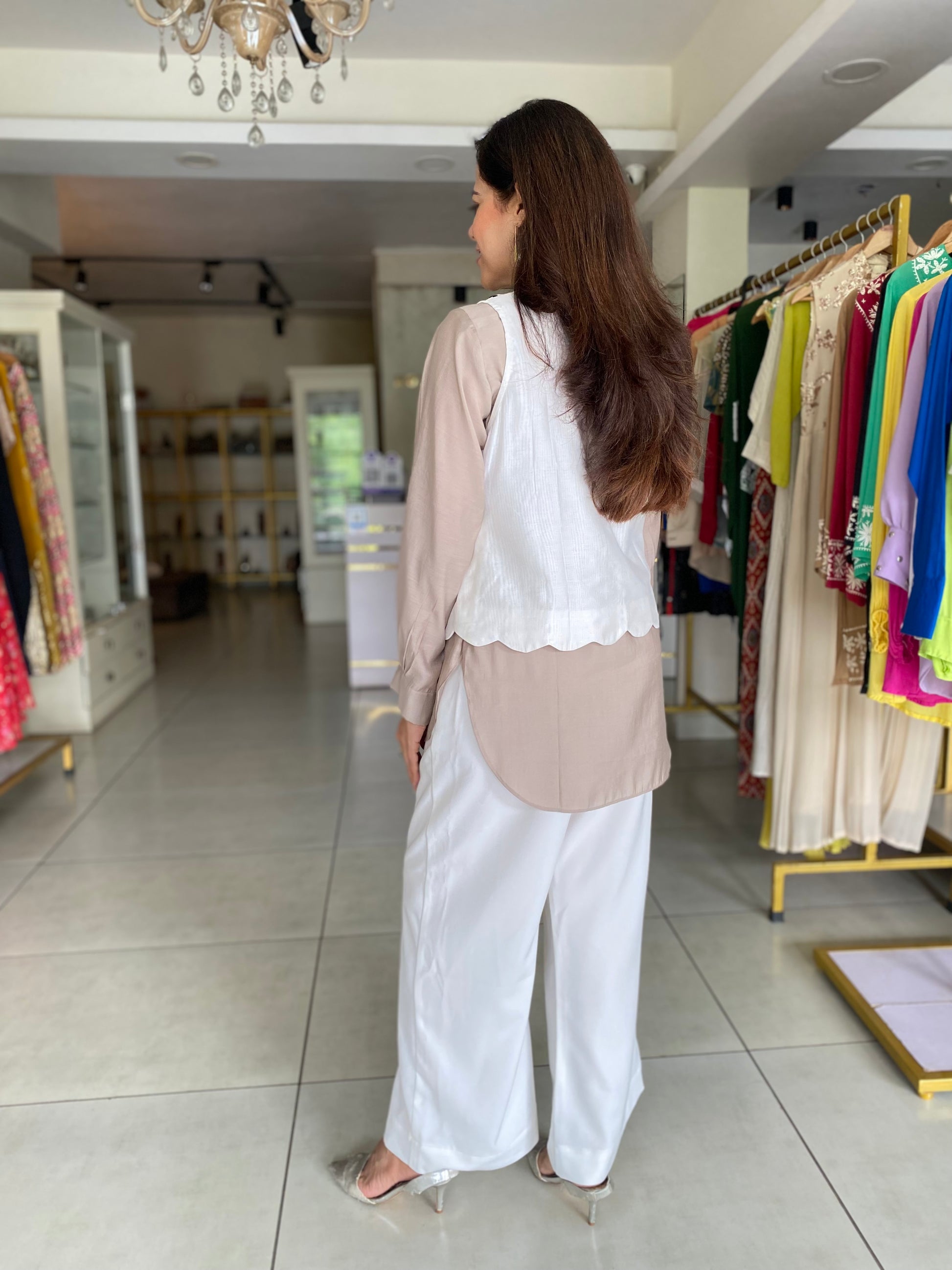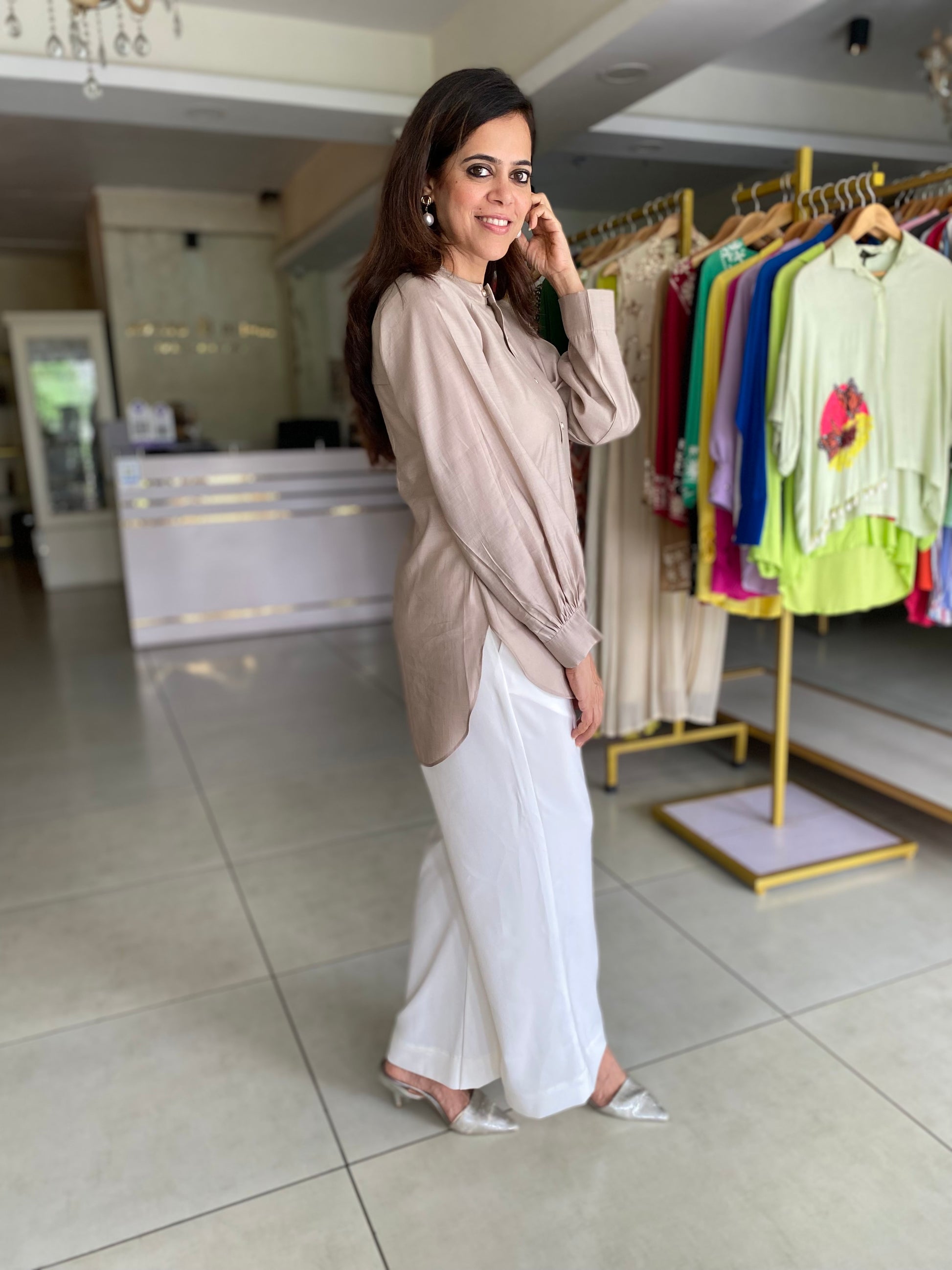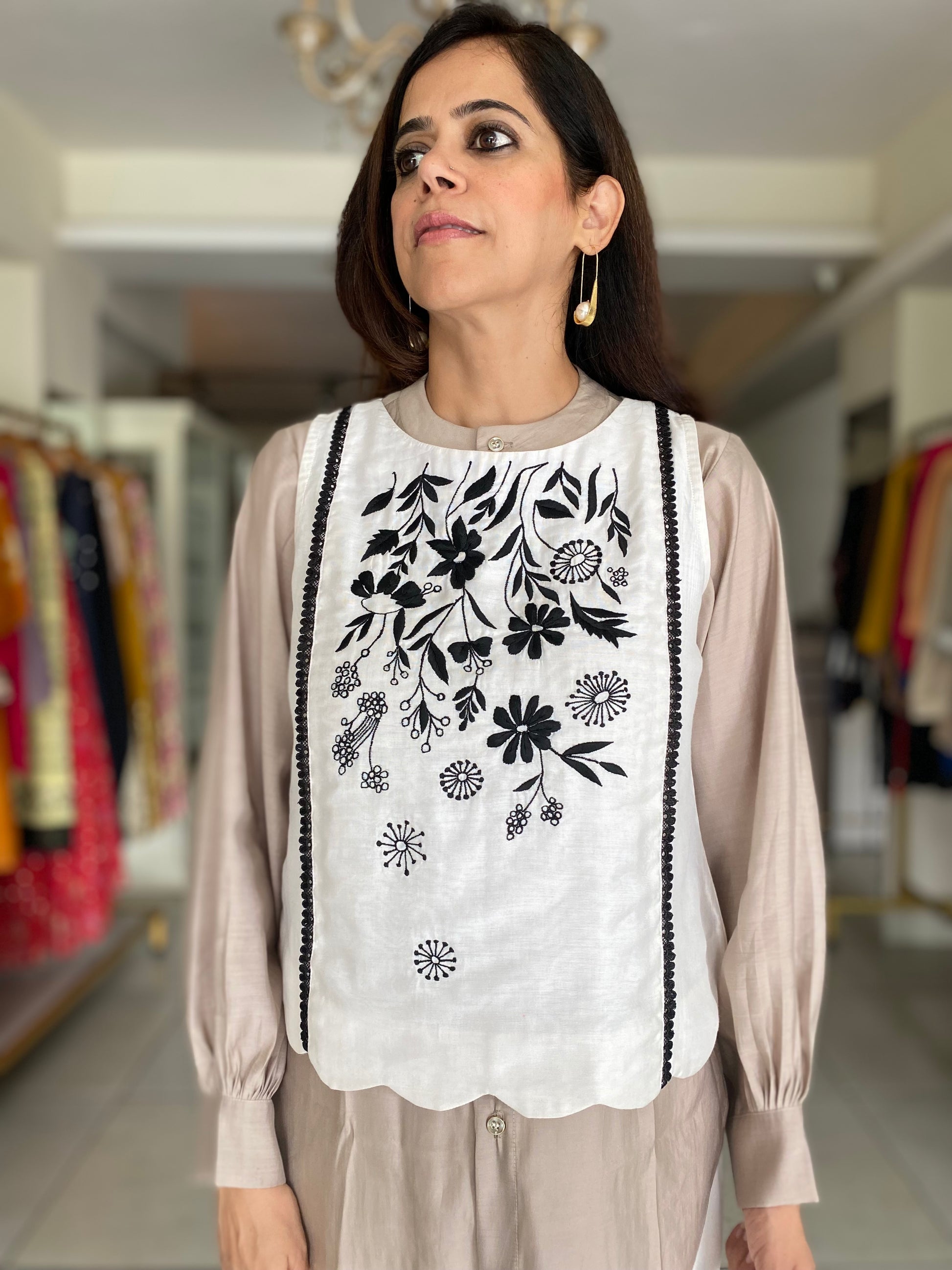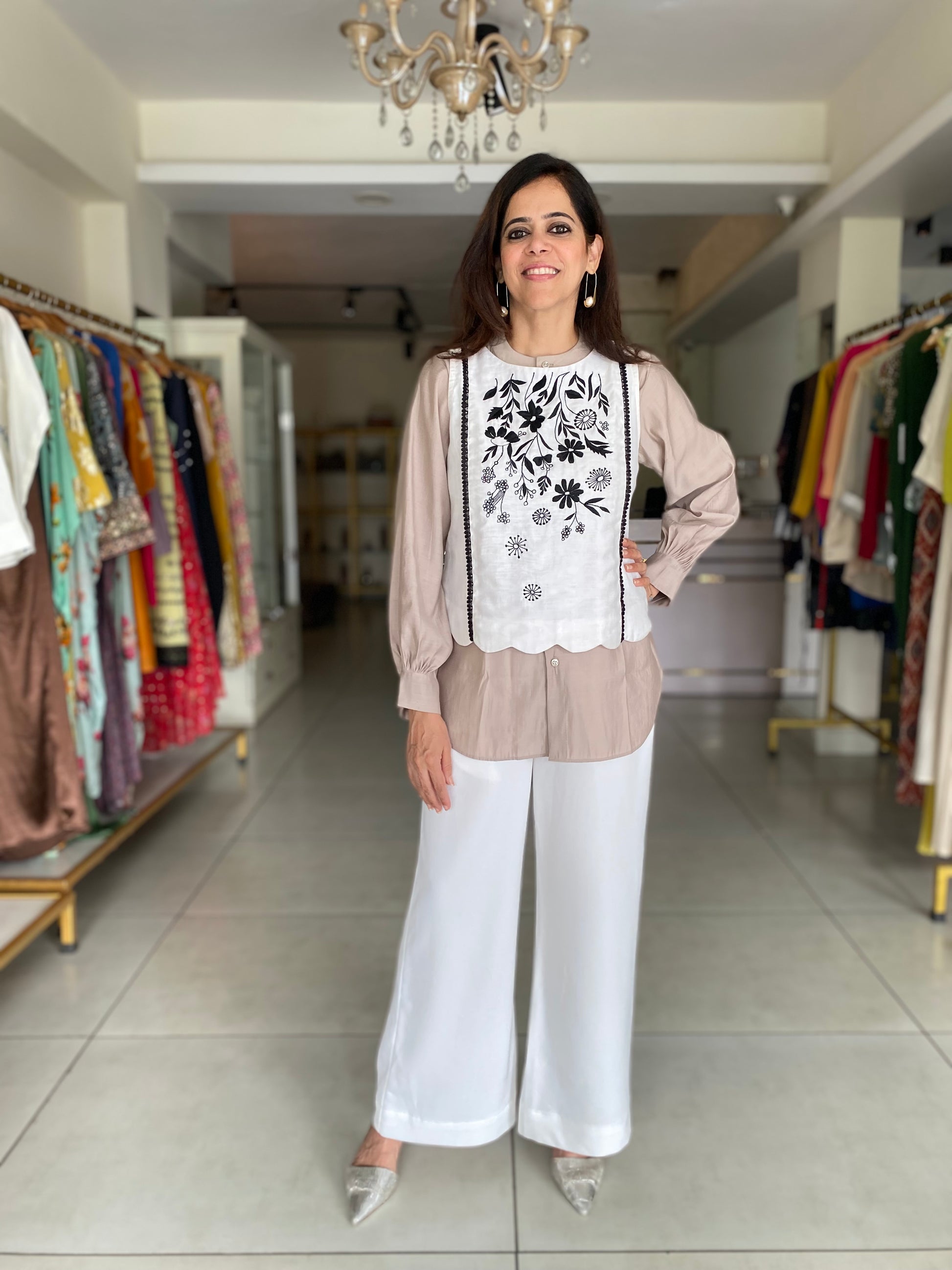 A chic and versatile set featuring a handcrafted Crop Top in luxurious Chanderi, embellished with fine Resham threadwork for a touch of artisanal elegance. Paired with a soft and breathable Muslin shirt, this ensemble beautifully balances tradition with modern sophistication.