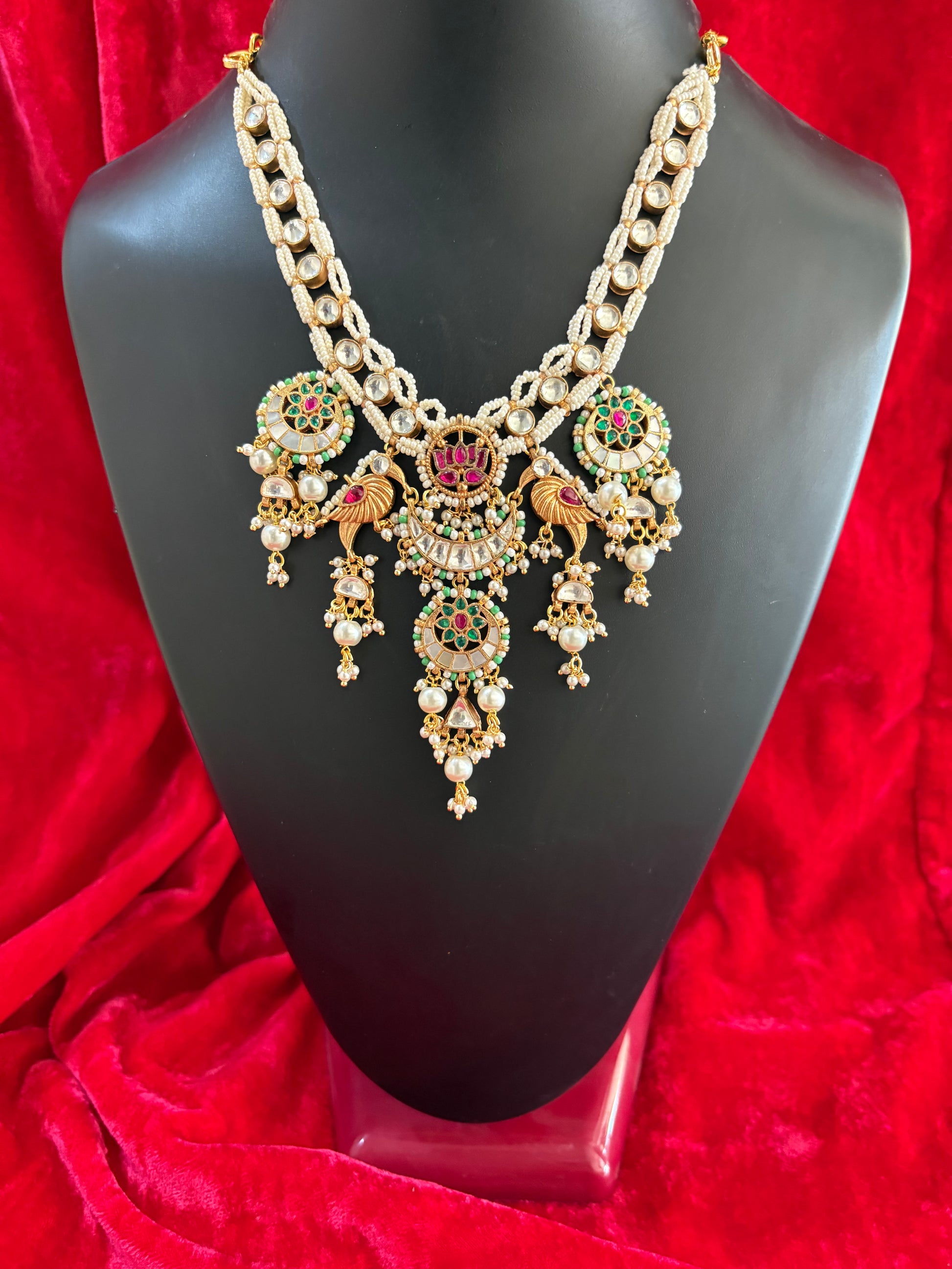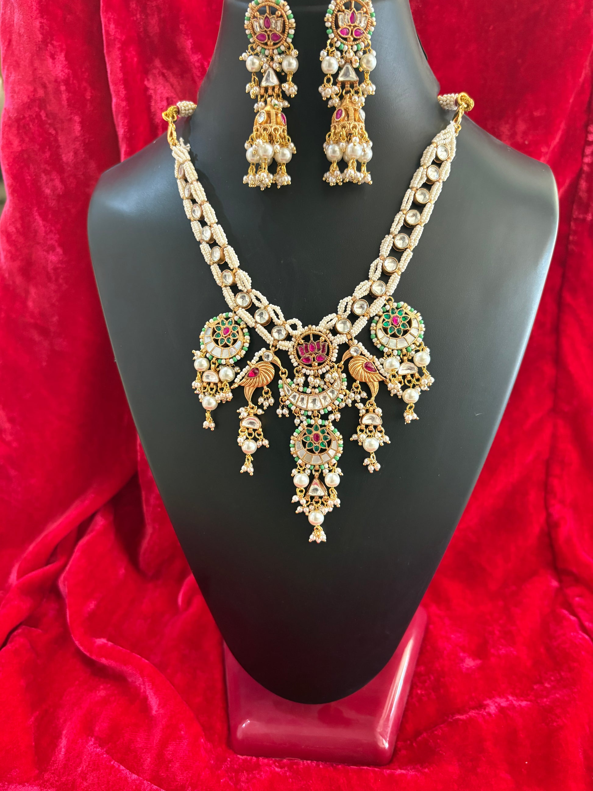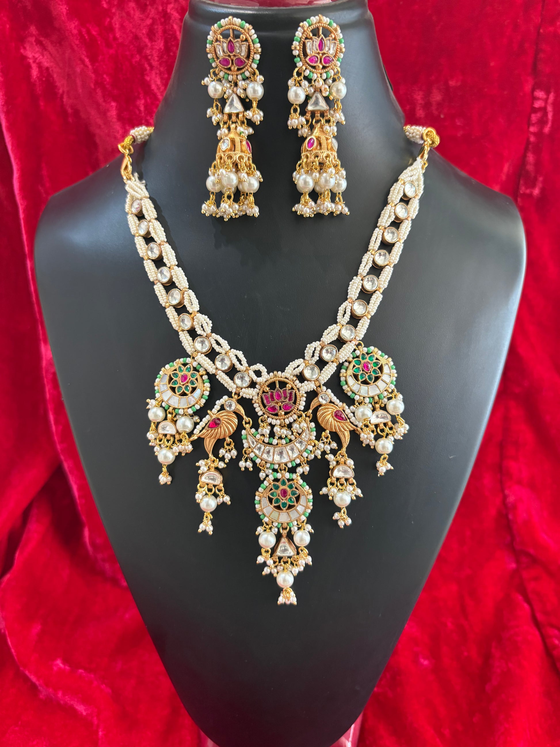 | Exquisite Jadau craftsmanship with intricate detailing Adorned with shimmering polki stones and colorful gemstones Elegant necklace design that radiates timeless beauty Comes with matching earrings for a complete look Perfect for weddings, festive occasions, and traditional attire |