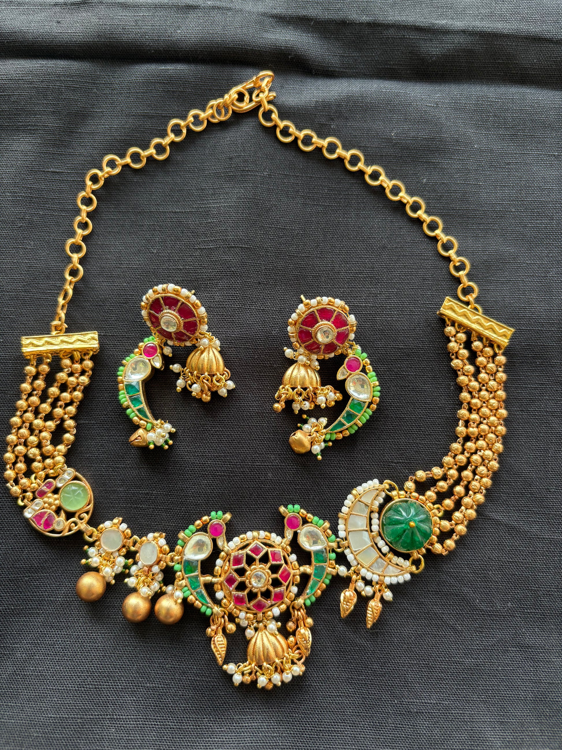| Magnificent Jadau craftsmanship reflecting royal elegance Adorned with sparkling polki stones and vibrant gemstones Bold, statement choker design for an imperial look Paired with matching earrings for a complete ensemble Perfect for bridal wear, grand occasions, and traditional festivities |
