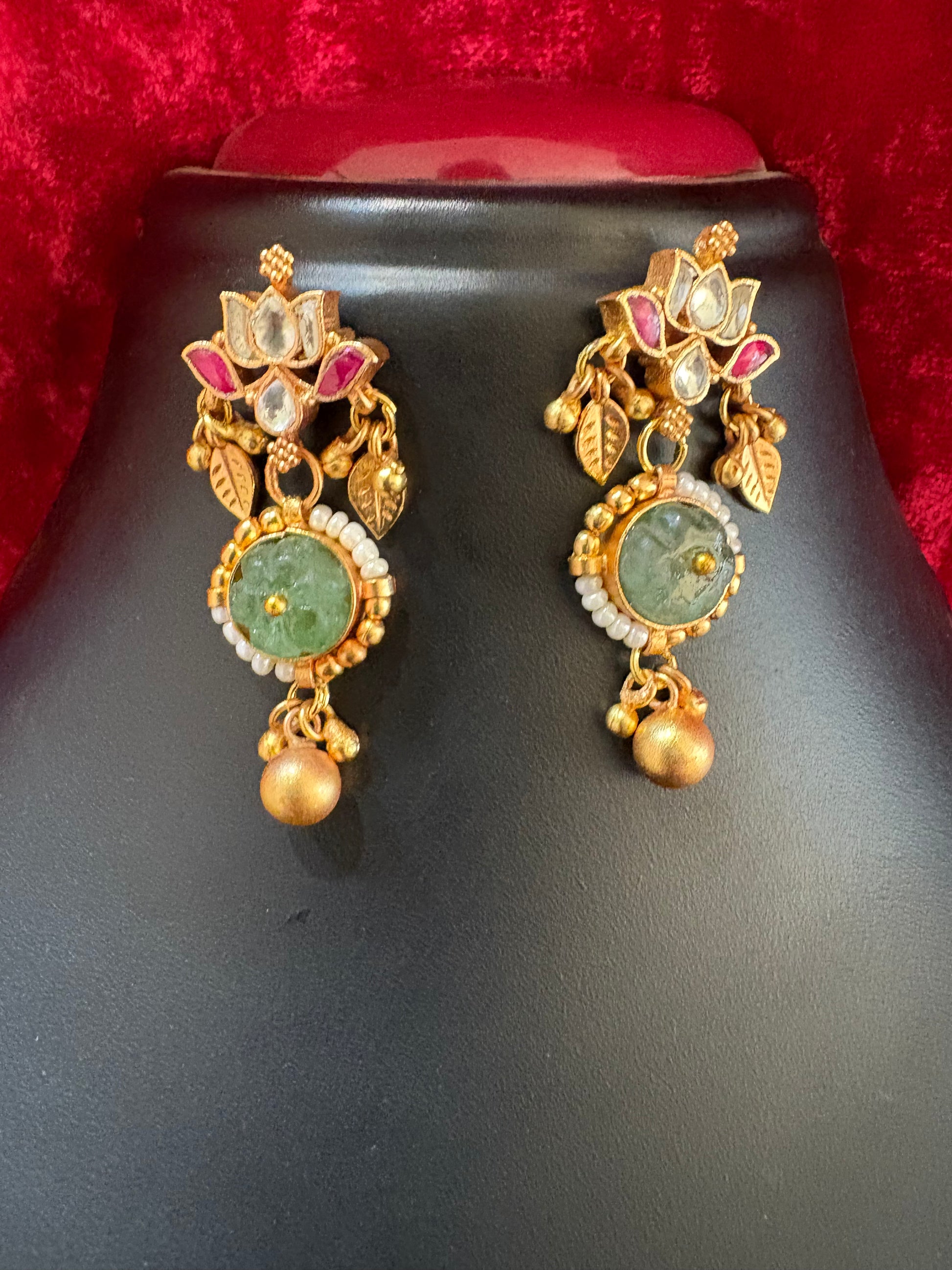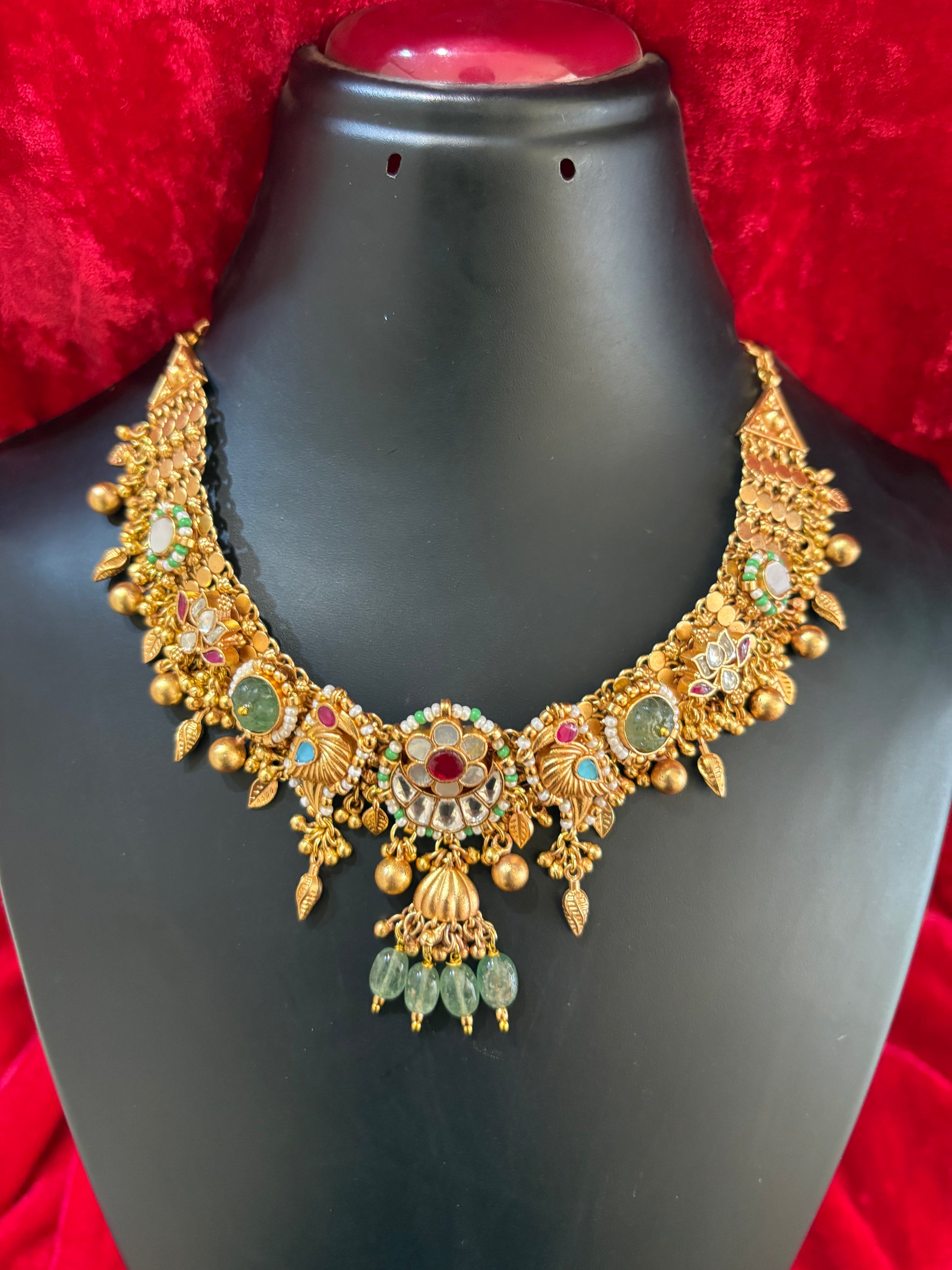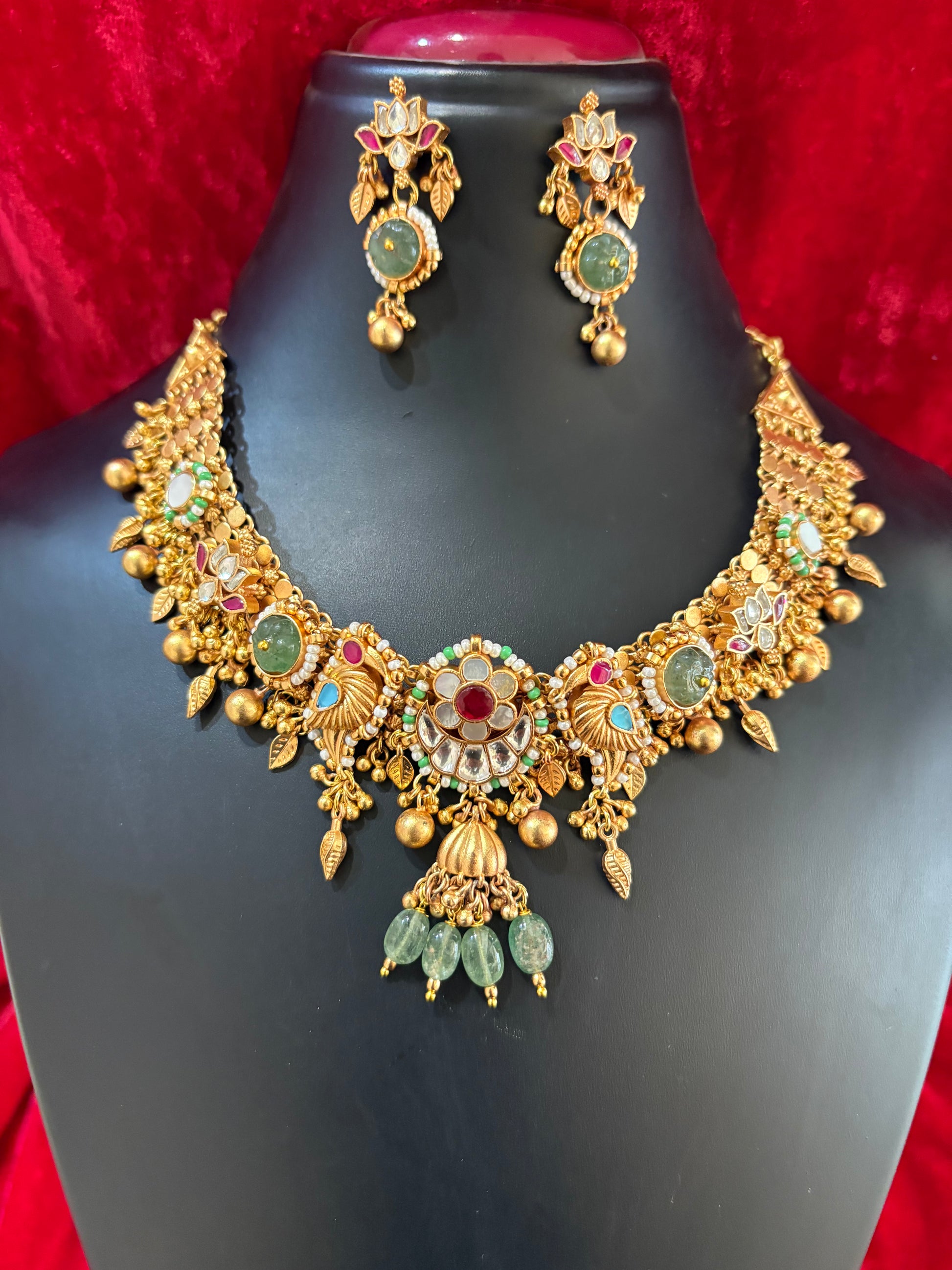 | Reflects a brilliant sparkle with detailed Jadau artistry Adorned with dazzling polki stones and rich gemstone accents Designed as a statement choker that exudes elegance and grace Paired with matching earrings for a cohesive, regal look Ideal for bridal attire, festive occasions, and cultural celebrations |
