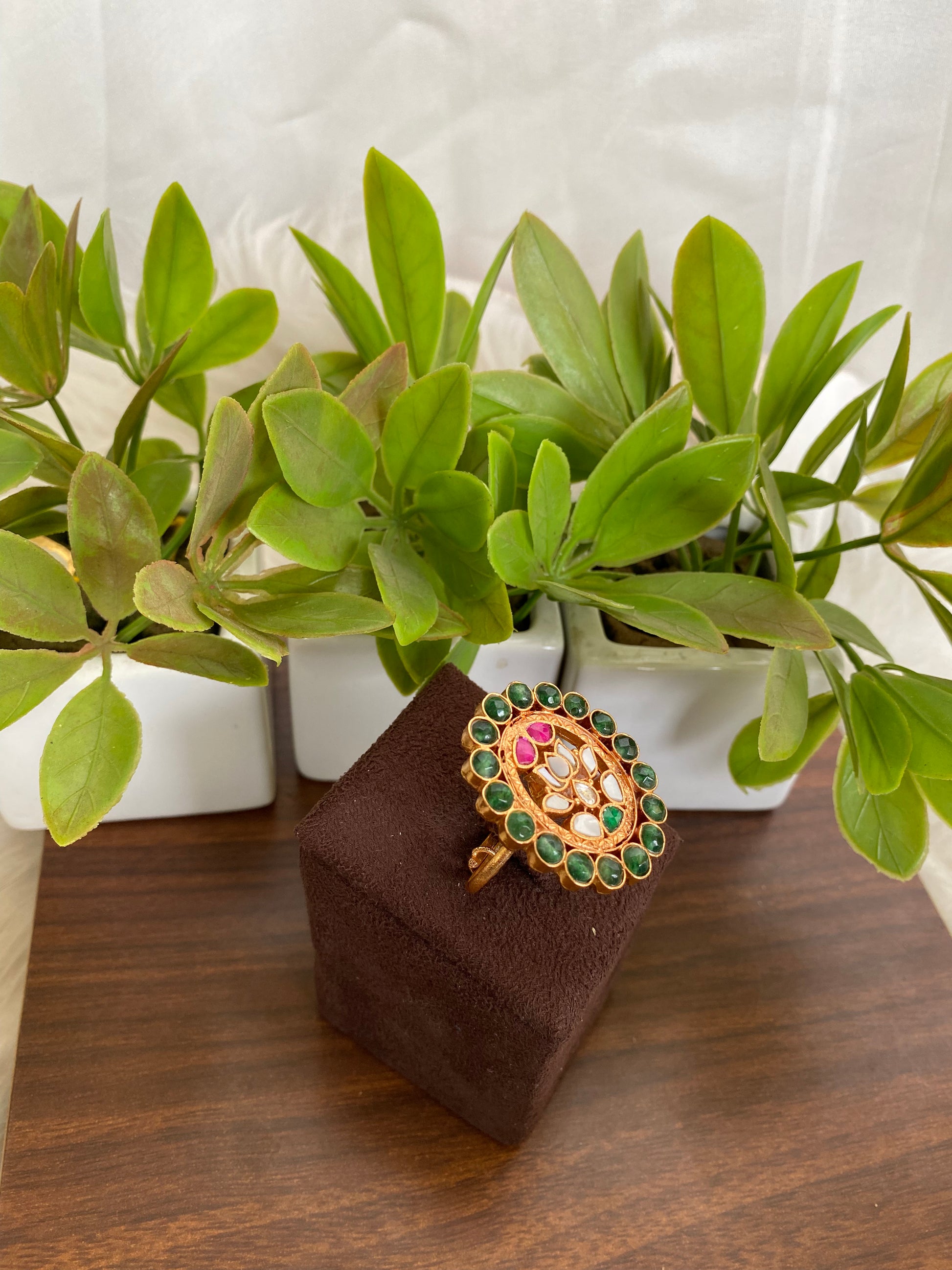 | Delicate, divine, and deeply rooted in tradition, our Jadau Lotus Ring is a graceful tribute to timeless craftsmanship. Centered around an intricately designed lotus motif, this statement ring is adorned with classic Jadau work and accented by dainty green beads that add a refreshing pop of color |
