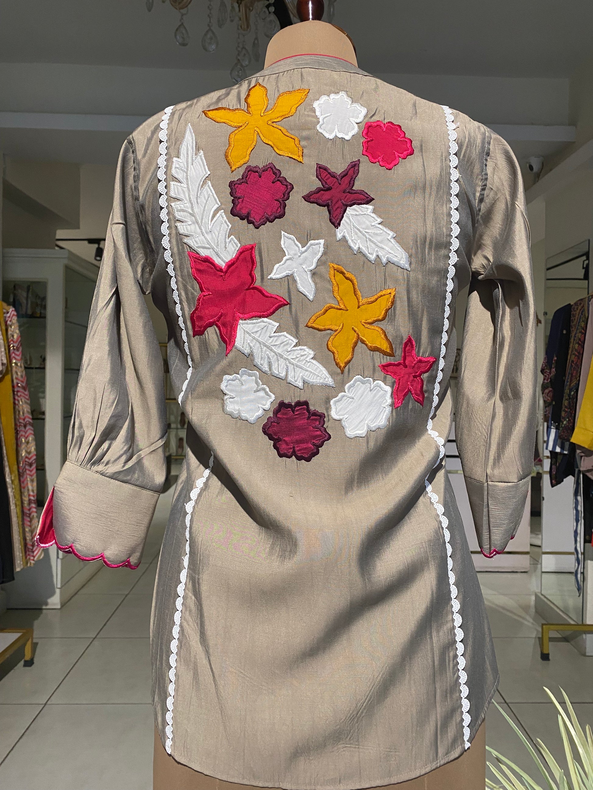 Crafted in soft and breathable muslin fabric, this top features delicate appliqué detailing that adds texture and elegance. Available in a range of beautiful colours, it is designed for versatile styling – pair it with denims for a chic casual look or with skirts and trousers for an elevated ensemble.