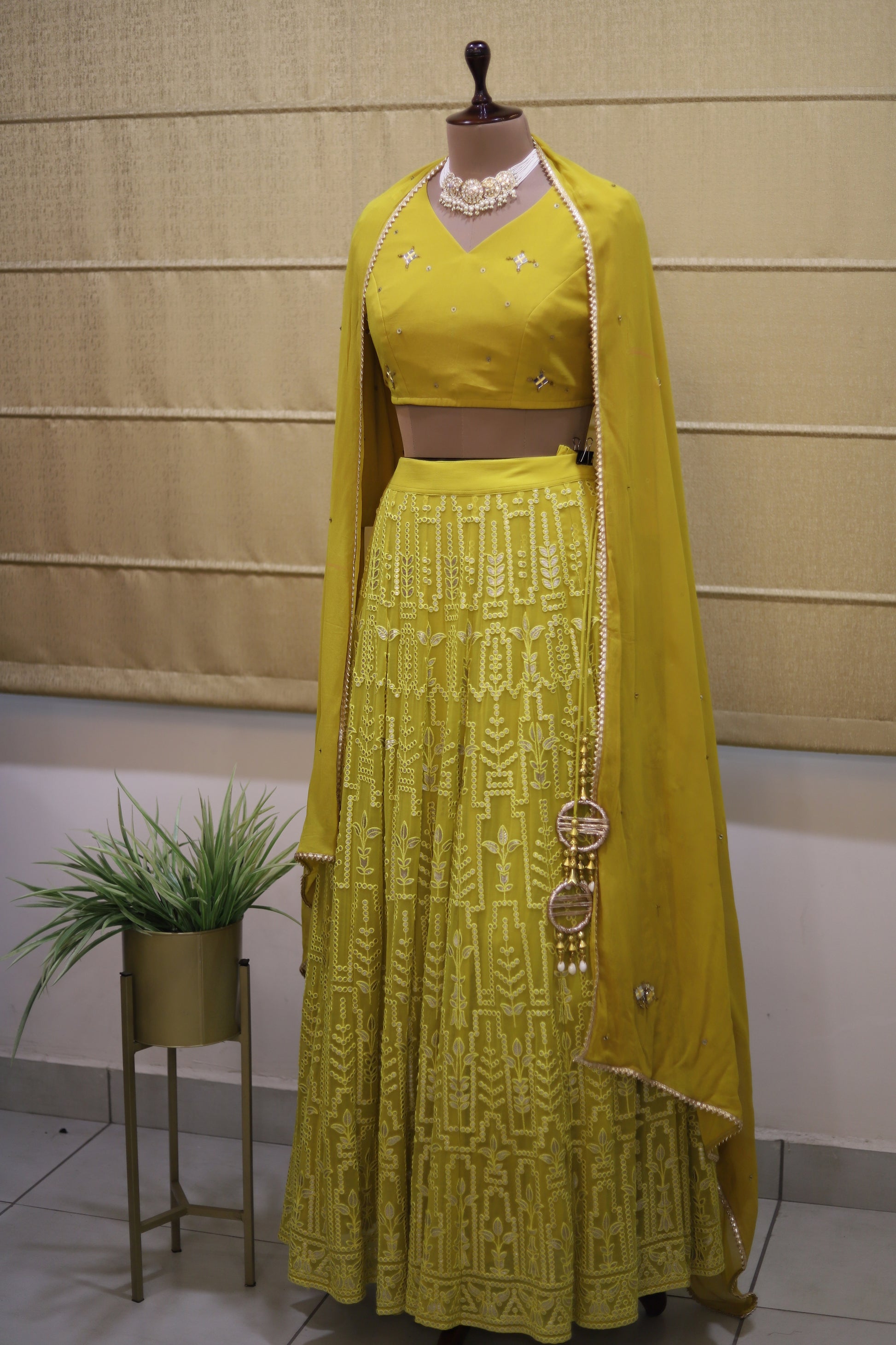 Radiate festive charm in our mustard yellow lehenga — a vibrant blend of tradition and elegance. Crafted with intricate detailing and a flattering silhouette, it’s perfect for weddings, sangeet, and festive celebrations.