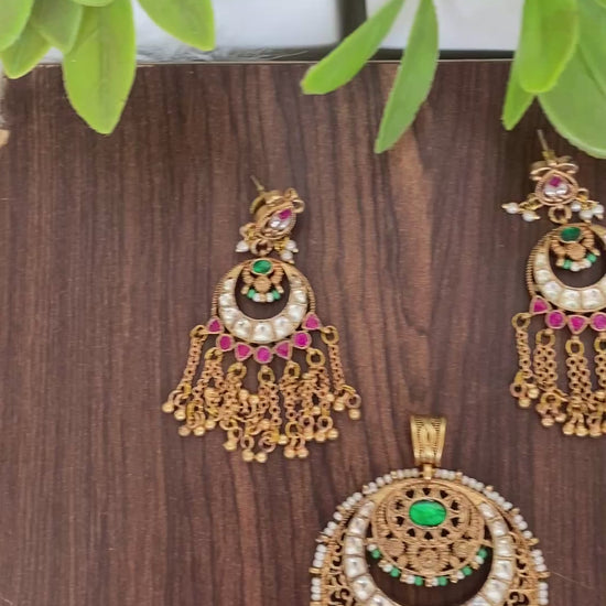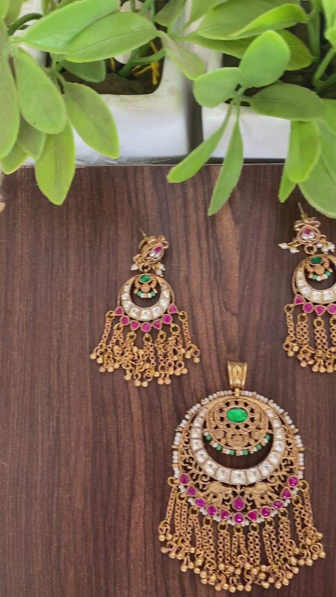 | This gold-plated Jadau pendant set offers unmatched versatility — wear it with a long chain, a short chain, or simply style the earrings solo. Crafted with intricate detailing, it’s the perfect fusion of tradition and modern charm for any occasion. |