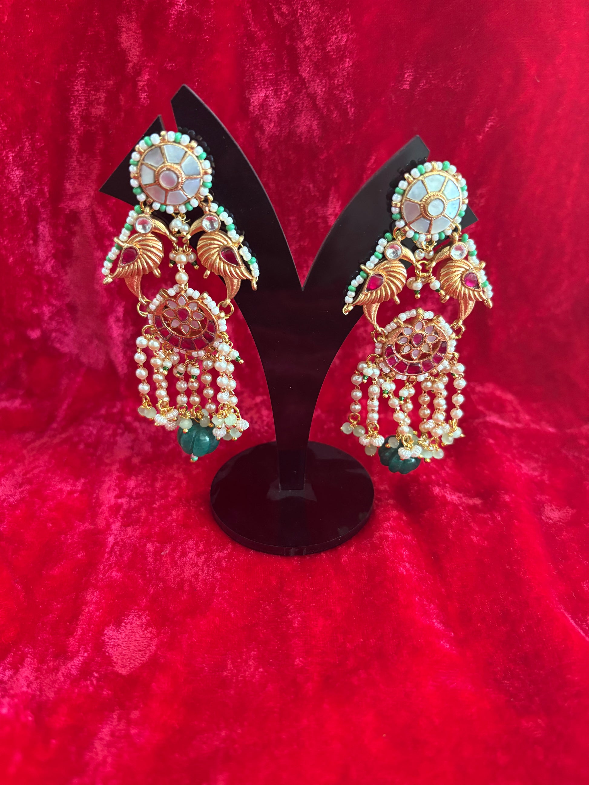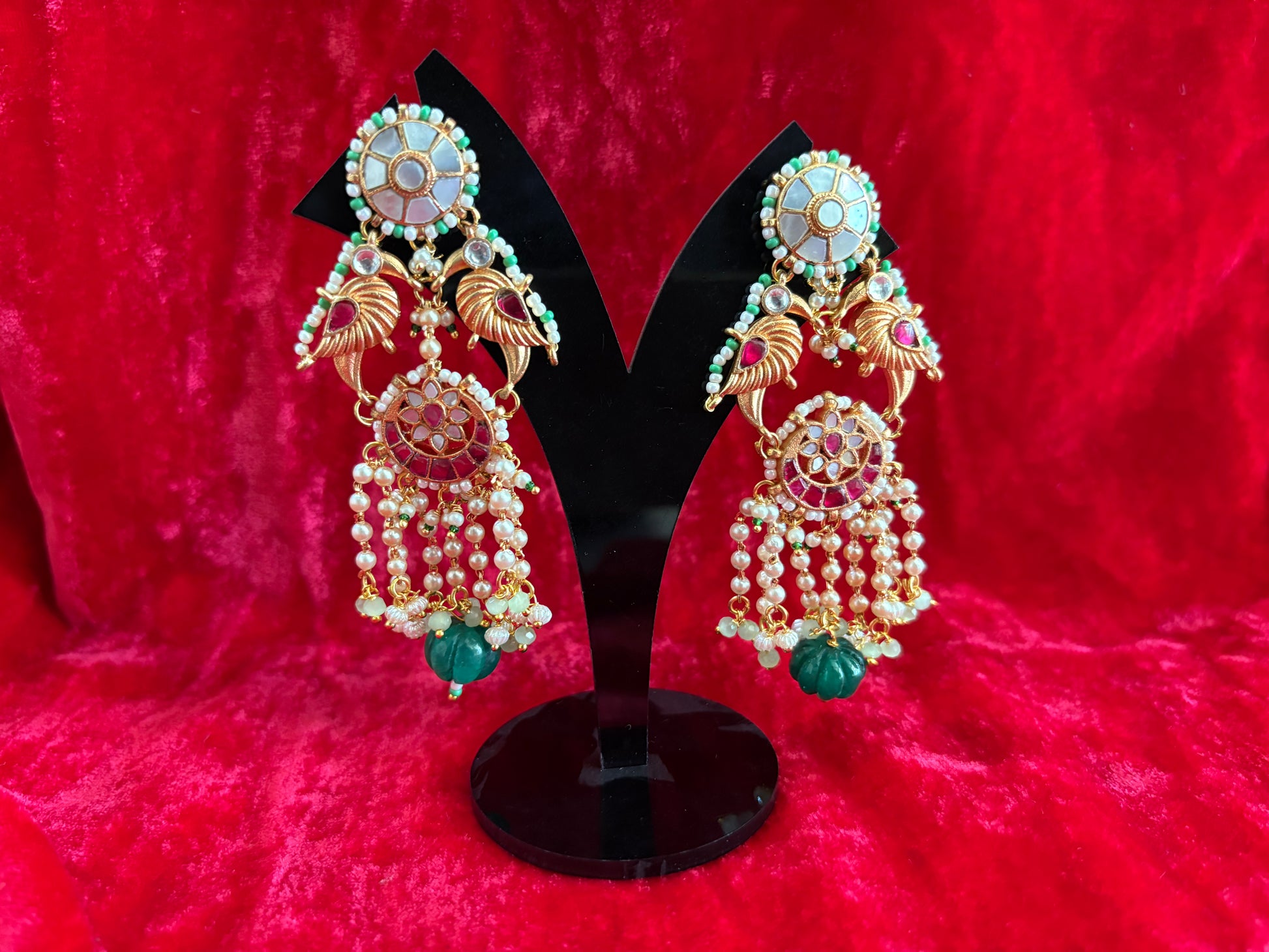 | Exquisitely handcrafted Jadau earrings, showcasing intricate detailing and regal charm Adorned with polki stones and lustrous gemstones, exuding timeless elegance A perfect blend of heritage craftsmanship and modern sophistication Lightweight yet striking, ideal for weddings, festive occasions, and grand celebrations Elevates any traditional look with a touch of royalty and refinement |