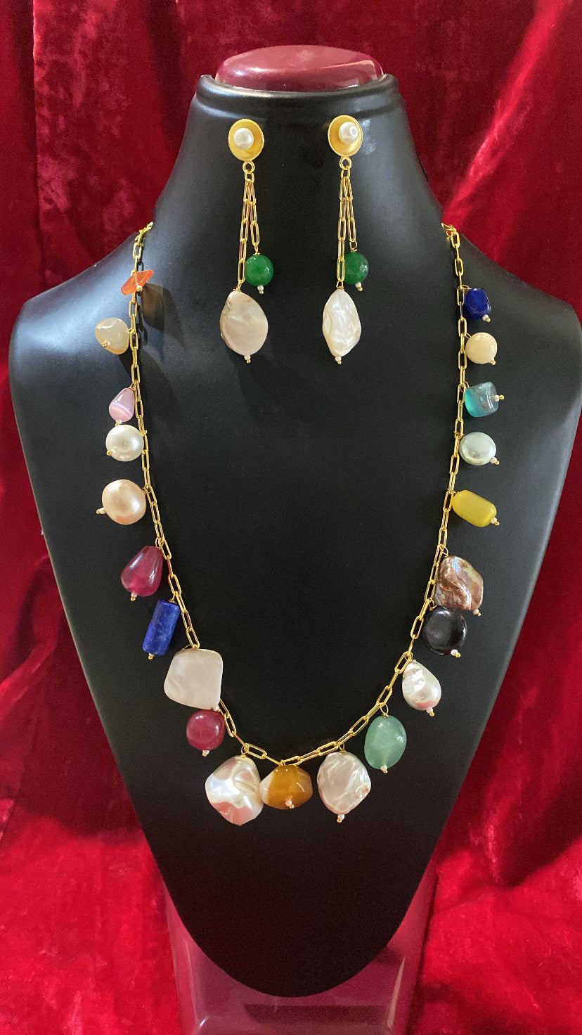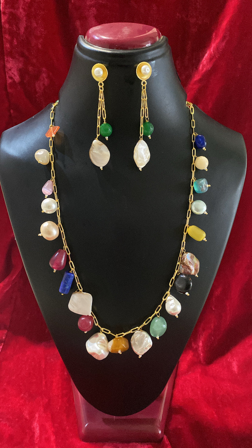 | A stunning long necklace set featuring intricate craftsmanship and elegant design Adorned with sparkling gemstones and delicate polki stones for a regal touch Perfect for adding sophistication and charm to any traditional or festive outfit Ideal for bridal wear, weddings, and special celebrations A timeless piece that enhances your look with luxury and grace |